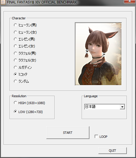 ソフト起動後、キャラの選択、LOW、HIGH画質の選択、言語選択ができ、STARTボタンを押すとベンチマークが始まる。ミスラ(ミコッテ)にニラニラしつつもランダムを選択して、LOWでベンチ開始。